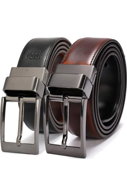 100% leather belt, Nickel-free Alloy Buckle 1.25" wide belt, suitable for size 28-58 waist, plz buy one size larger than your waist Black and Cognac reversable belt, silver single prong buckle, black buckle, plaque buckle, 6 styles for the buckle to choose,5 grommets in the belt, cuttable to size Rotated buckle making it easy to reverse the belt from black to cognac and vice versa Gift box presented, 12 months buy return or refund, quality garanteed