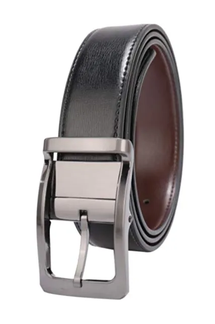 100% leather belt, Nickel-free Alloy Rotated Buckle 1.25" wide belt, suitable for size 26-54 waist, plz buy one size larger than your waist Black and brown reversible belt, wide ring silver rotated buckle,wide ring black rotated buckle,plaque rotated buckle,brushed silver rotated buckle, turned plain buckle and turned design buckle, 6 styles for the buckle to choose,5 grommets in the belt, cuttable to size Rotated buckle making it easy to reverse the belt from black to coffee and vice versa Gift box presented, 12 months buy return or refund, quality garanteed
