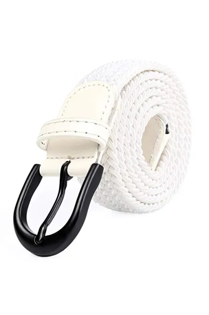 SIZE and COLOR: 27 colors with Matching Leather Tip and Belt, Waist Size: X-Small (24"-26"), Small (28"-30"), Medium: (32"-34"), Large: (36"-38"), X Large: (40"-42"), XX Large: (44"-46"), XXX Large:(48"-50") DURABLE: Elegant braid belt with elastic woven Polyester-blend material for strength and flexibility MATERIAL SPEC: strap is 1.29" Inches (3.3CM) wide and made High Stretch Bend Thread QUALITY BUCKLE: Gloss Solid Metal buckle fastening / Polyester-blend soft elastic belt Glossed smooth metal head that buckles at any position on the belt for exact fit MATCHING PANTS: Deep solid colors easily match for golf pants, jeans and business casual pants