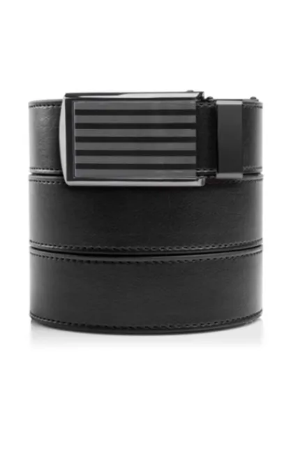 INCREDIBLY COMFORTABLE FIT - No holes ratchet belt means you can precisely adjust your belt to the perfect fit. SIMPLE TO USE - Our easy to use buckle makes adjusting your belt effortless and it can be easily interchanged with our straps. CUSTOM SIZES - Quickly and easily trim down the strap to your exact waist size. Say farewell to "in-between" sizes. STYLISH FAUX LEATHER - Our distinctive buckle and our high quality animal-friendly vegan leather provide the finishing touch to your outfit. SIZING - Each belt fits up to a 48" waist. Straps are 1-1/4" wide. Buckles are 1-5/8" wide x 3-1/2" long.