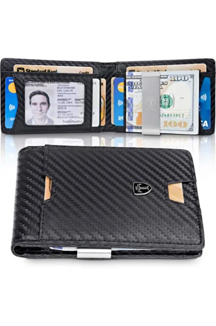 ✅ FUNCTIONAL & SLIM – Travando’s Wallet offers 9 card pockets: 1 easy-access front pocket and 8 inner pockets. The slim wallet is ideal for carrying business cards, credit and debit cards, bills etc.. The outside notch allows you to push out the cards easily ✅ INDUSTRY-TESTED SECURITY - Tested by an independent German quality control institute. Our wallets block the 13.56 MHz band and protect against data theft by RFID scanners. ✅ INTEGRATED MONEY CLIP - The metal money clip allows you to clip several bills inside your wallet ✅ REFINED & STYLISH - Designed in Germany to best combine elegance, quality and convenience. Travando minimalist wallet is crafted with premium materials and great attention to detail ✅ SLIM DOWN YOUR POCKET – We kept the dimensions of our slim wallet to 4.13" in x 2.3" in x 0.4" in. It will fit in your pocket perfectly without bulging out