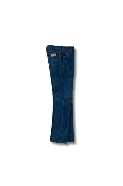 FR Cotton Imported 14.75oz 100% FR Cotton Denim; Waistband with button closure Traditional cut jeans fit over boots; Traditional four pockets jean Flash fire rated- meets NFPA 2112 Imported by Wrangler Arc Rating: 23.8 / HRC: 2