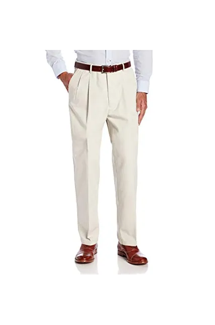 100% Cotton Machine Washable Pleat-front pant with side-slant pockets featuring hidden expandable waist and button-through welt pockets at back No-iron design Classic fit