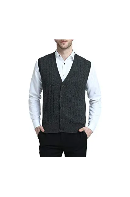 Kallspin Relaxed Fit Mens V-Neck Cable Knit Cashmere Sweater Vest with Front Button
