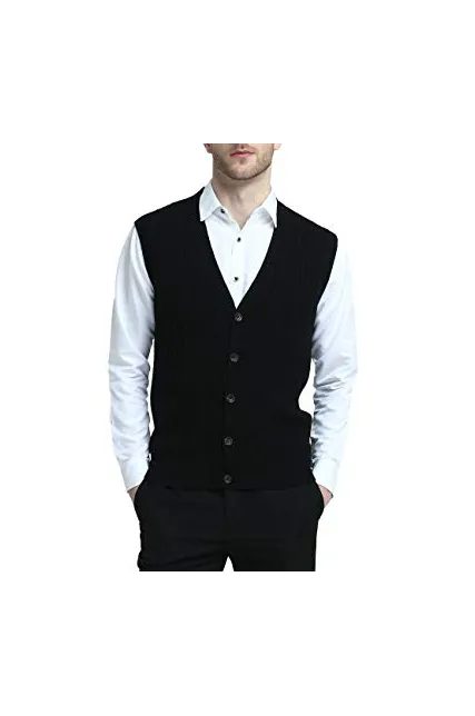 Kallspin Relaxed Fit Mens V-Neck Cable Knit Cashmere Sweater Vest with Front Button