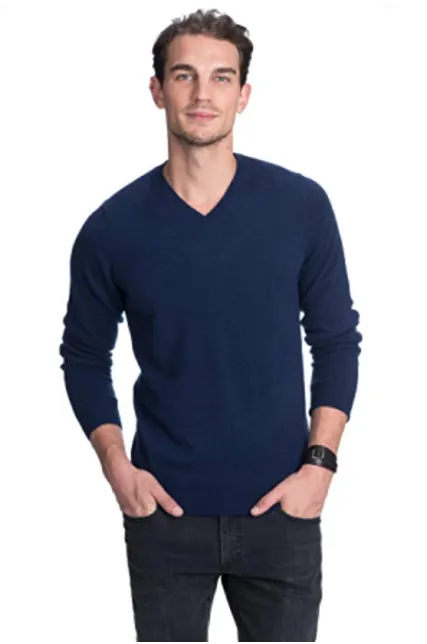 100% Cashmere ***This item may run SMALL. Size up if loose fitting is expected. *** 100% Genuine 2-ply Inner Mongolian Cashmere Ribbed V-neck, cuffs and hem. Superior softness with easy fit comfort. Super versatile; Light weight; Relax fit. Classical design. Wearing with shirt shows formal for working, and wearing with jeans shows leisure at home and party. Densely knitted with the finest and long staple cashmere which provides best anti-pilling performance Model Measurements: height: 6'2"/ waist: 32". Model is wearing size:Large.