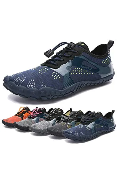 DURABLE AND UNIQUE SOLE: Professional anti slip rubber outsole with a unique pattern, increase the friction and track adhesion to prevent slipping beside the pool and in the wild.unique and durable sole with seven holes on each bottom to ensure proper water flow out of them which creates a cooler and healthier shoe environment, quick-dry, super comfortable during water sports. FOOT SAFETY AND COMFORTABLE: The rubber soles, with a really comfortable and thick foam arch-support insert inside of them, are flexible yet thick enough to protect your feet from stepping on rock and stone. At the same time, the insole perfectly matches the shoes and prevents the insole gets detached when you are hiking or playing water sports. FASHION AND PRACTICAL LOOK OF TOES: Fashion shoes tip, with a toe appearance, give you a more fashion and unique wearing experience. Although there are not separate slots, but thicker toe caps give more cushioning that you needed to provide support when hiking and climbing. Please do not worry they rub your big toe when walking, we provide enough space to ensure comfort. GOOD ELASTICITY AND CONVENIENT: Breathable and smooth fabrics with fine stretch on uppers. Non-mesh, don't let the sand into the shoes. The shoe is ultra-thin, flexible and comfortable. An ideal shoe for rowers, surfers, kayakers and SUP fanatics, the shoe provides grip and comfort out on the water and packs easily into a dry bag at the end of the day. MULTIFUNCTIONAL SHOES IN DIFFERENT CONDITIONS: The shoes are amphibious shoes which can make sure you can enjoy your life in land or in water. You can use the aqua shoes in surfing, canyoning, kayaking, camping, zip-lining, swimming, jumping, river trekking, paddle rafting, snorkeling, raining, beach visiting, shopping, traveling, water aerobics, jogging, walking,any water playing or land playing.