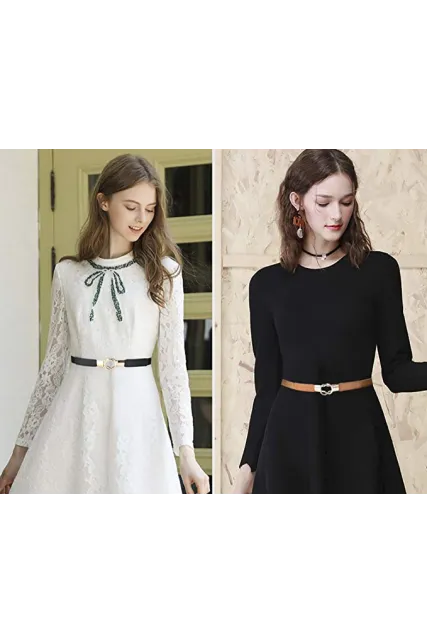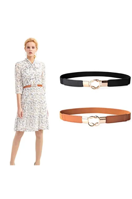 - ❁❁2 Pack - One prchase for 2 different colors elastic women skinny belt( Black/White, White/Brown, Black/Brwon). This thin elastic waist belt makes with well-made metal buckle, good quality faux leather.
