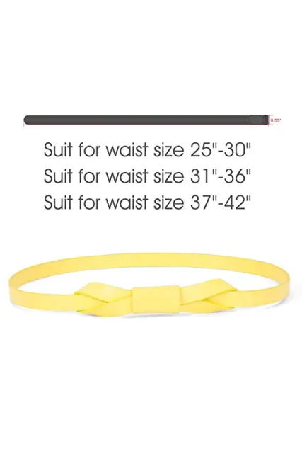 - How long and wide is this women belt?--- The skinny belt is suitable for waist size from 25”-41”, which covers the size from small size to plus size. Width 0.55 inch that is very skinny and thin for your dress.
