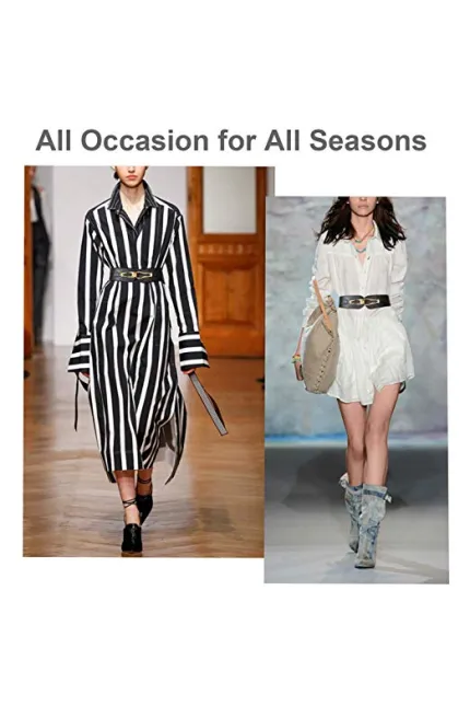 - The Stylish Wide Women Belt is perfect for decorating with all kinds of clothes as you like. This women belt is perfect for dresses, skirts,sweaters, down jackets or other clothes for all occasion in the four seasons.