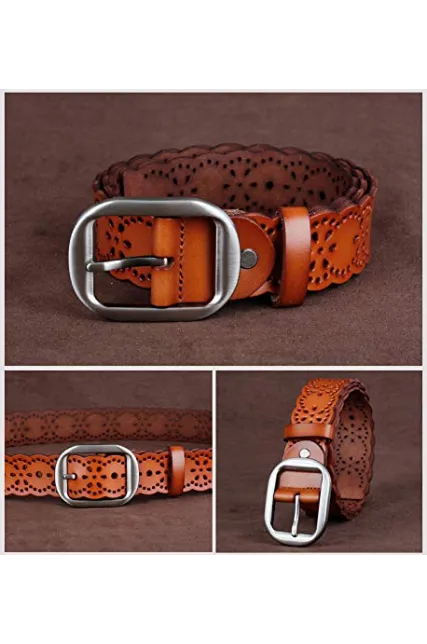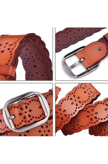 TUNGHO Womens Hollowr Flower Genuine Leather Vintage Belts With Needle Buckle Plus Size XXXL
