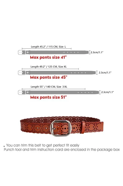- About Size: this belt length without buckle is 49.2" / 125 CM, buckle to center hole is 41.3" / 105 CM, applied maximum waist 46" / 117 CM, numeric size 16-18, the buckle can be removed and a free hole puncher and screwdriver are provided, in order to adjust the belt length to fit, whatever you are fat or slim, one-size-fits-all.
