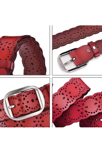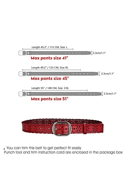 - About Size: this belt length without buckle is 43.3" / 110 CM, buckle to center hole is 35.4" / 90 CM, applied maximum waist 39" / 102 CM, numeric size 8-10, the buckle can be removed and a free hole puncher and screwdriver are provided, in order to adjust the belt length to fit, whatever you are fat or slim, one-size-fits-all.