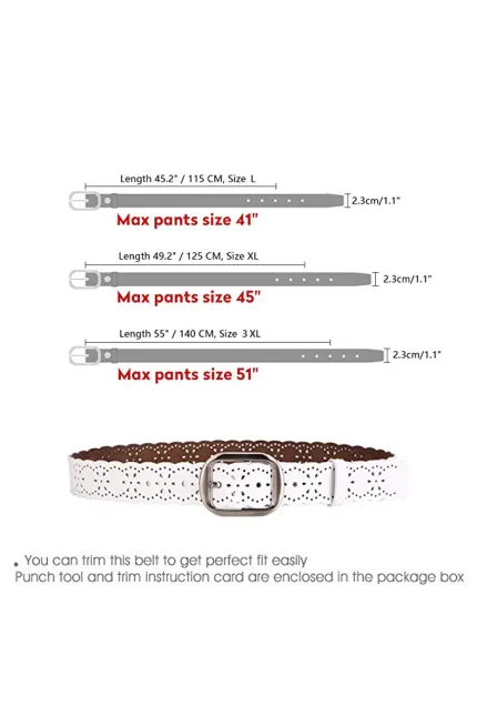 - About Size: this belt length without buckle is 55" / 140 CM, buckle to center hole is 46.5" / 118 CM, applied maximum waist 51" / 130 CM, numeric size 22-24, the buckle can be removed and a free hole puncher and screwdriver are provided, in order to adjust the belt length to fit, whatever you are fat or slim, one-size-fits-all.