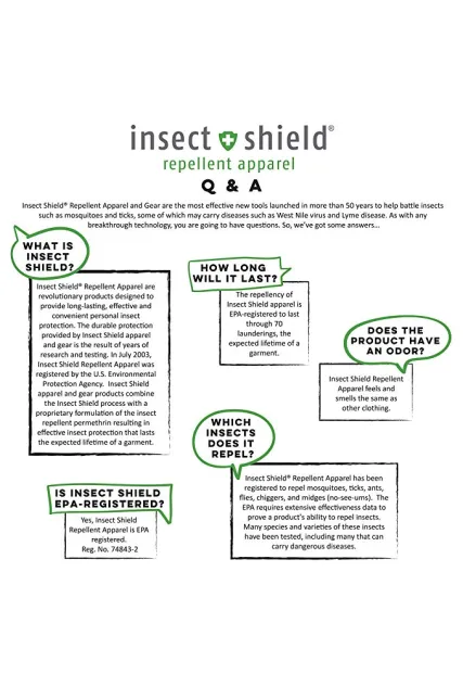 - BUILT-IN INSECT REPELLENT - Tested and proven to repel mosquitoes, ants, flies, chiggers and midges (no-see-um). Invisible, odorless protection with no restrictions for use! Active ingredient: Permethrin 0.52%.