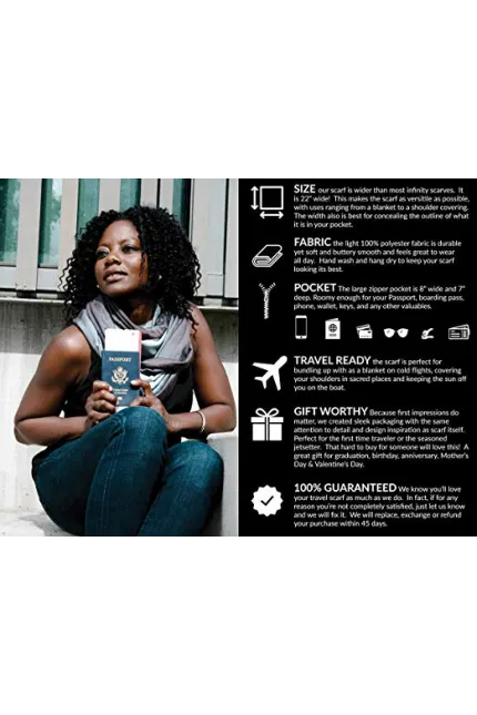 - EXPERIENCE MORE // No more clunky purses or awkward backpacks to get between you and your travel experience. Our Travel Scarf frees up your hands to be able to peruse fruit in the market, take that once in a lifetime photo, and explore a world class museum. Focus on the art, culture and where to next instead of worrying about pickpockets.