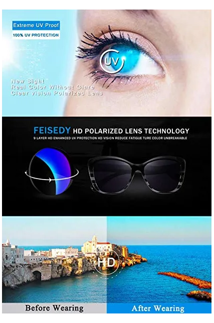 - FEISEDY Upgrade Structure - Thanks for the customer feedback on frame breakage and lens coating peeling. We adopt a stronger upgrade framework of German polycarbonate materials and 9-layer TAC polarizing lenses made in Japan to avoid peeling. Customer satisfaction is a priority.