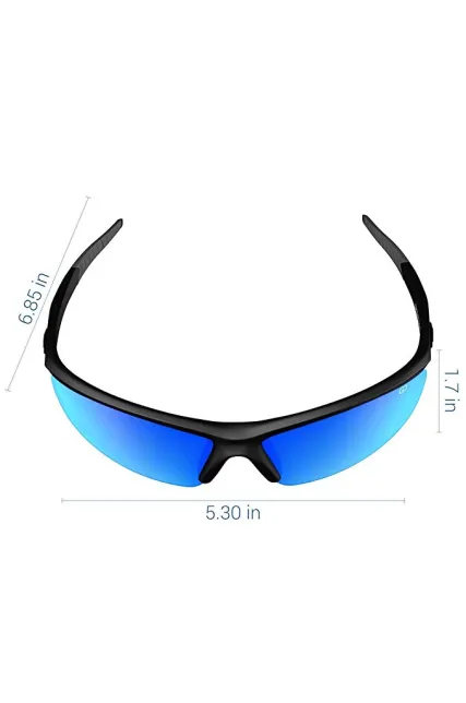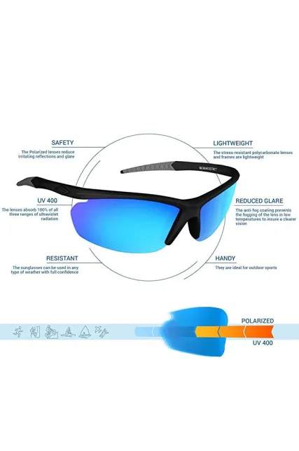 - Polarized lenses: The lenses reduce irritating reflections and glare caused by light reflected from surfaces such as water, road, sand or snow. They absorb 100% of UV light and eliminate 99% glare light. frame