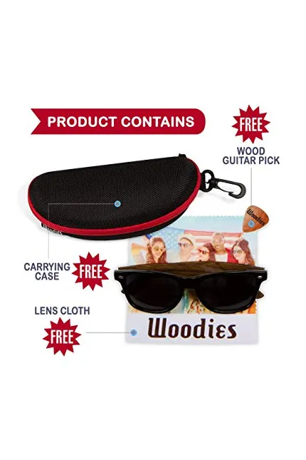 Came in a nice protective case along with some goodies I wasnt expecting: Guitar pick, graphic design microfiber cloth, Woodies sticker, and a silky smooth tie sack for the glasses. It looks professionally made, definitely on the same bar as Raybans! For someone who has a small head I worried these wayfarers would look too big on me but they look great! The walnut sides are a tad lighter than pictured but honestly, theyre gorgeous.