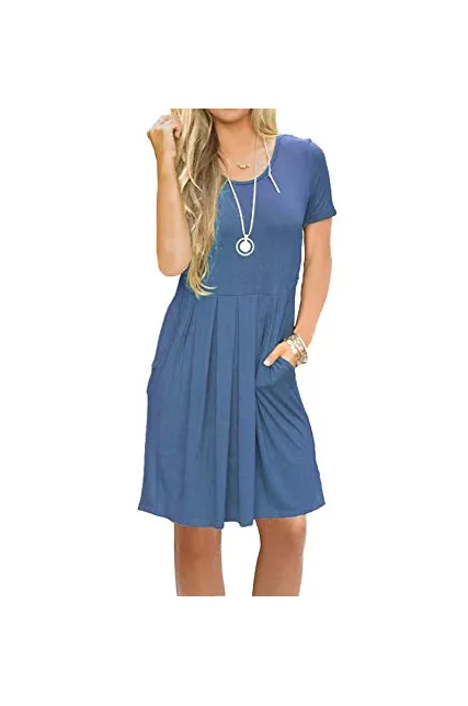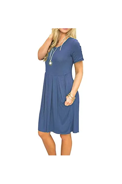 AUSELILY Women's Short Sleeve Pleated Loose Swing Casual Dress with Pockets Knee Length