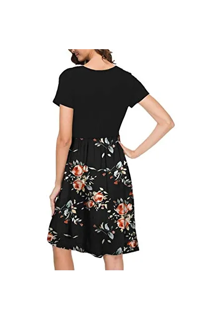 AUSELILY Women's Short Sleeve Pockets Empire Waist Pleated Loose Swing Casual Flare Dress