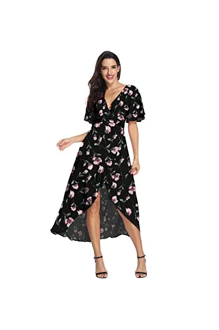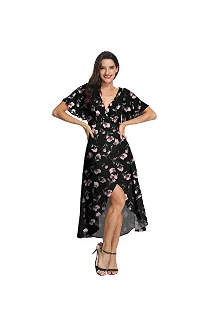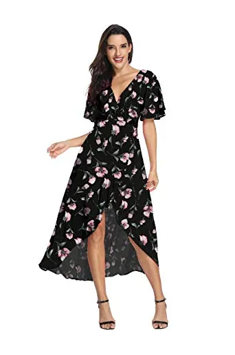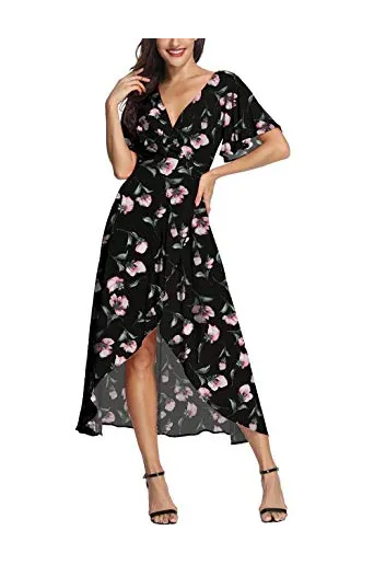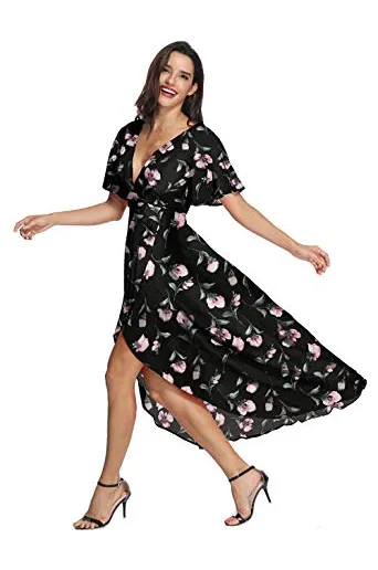 Azalosie Wrap Maxi Dress Short Sleeve V Neck Floral Flowy Front Slit High Low Women Summer Beach Party Wedding Dress