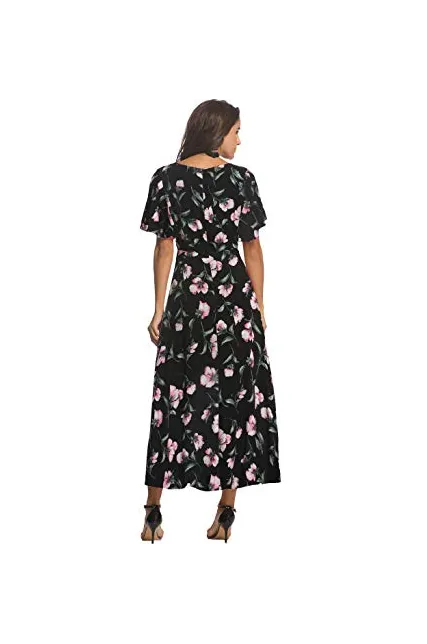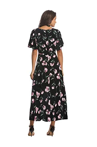 - ➤Feature: Faux Wrap maxi dress made you looking super feminine and elegant, the detail of hidden zipper on the back, puffy short sleeve, and the pleated upper v neck. The flowy front slit enables you to show your charming legs