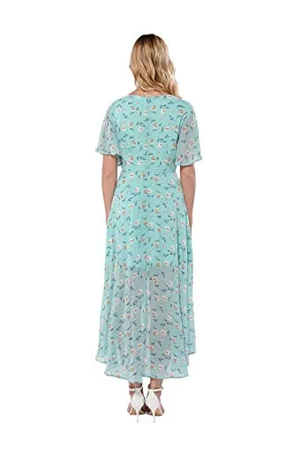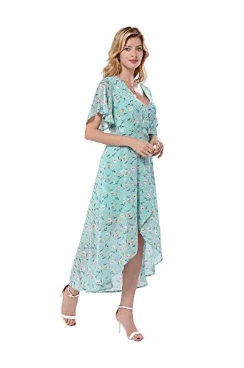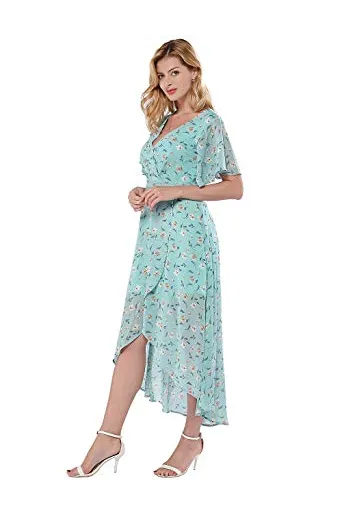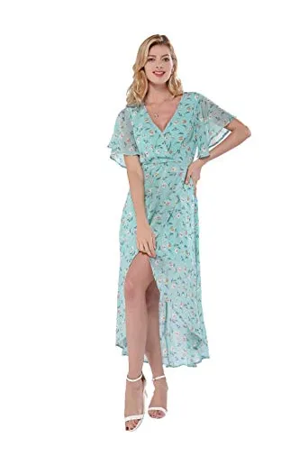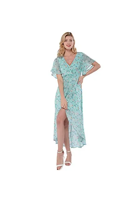 Azalosie Wrap Maxi Dress Short Sleeve V Neck Floral Flowy Front Slit High Low Women Summer Beach Party Wedding Dress