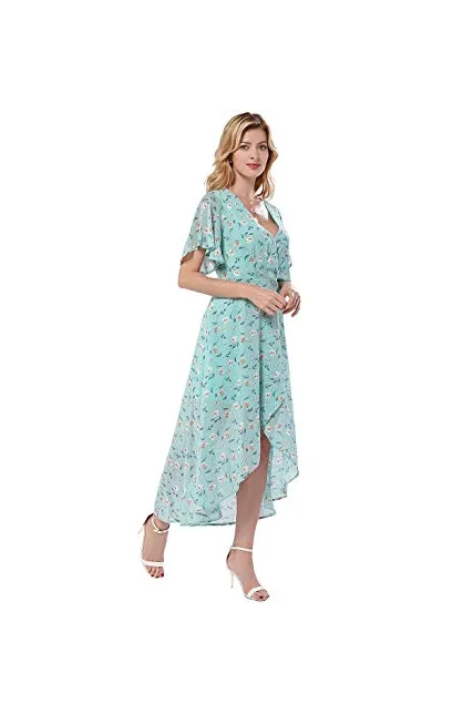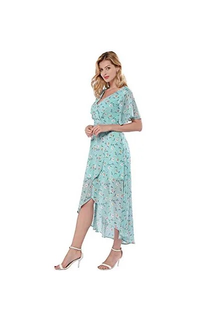 - ➤Feature: Faux Wrap maxi dress made you looking super feminine and elegant, the detail of hidden zipper on the back, puffy short sleeve, and the pleated upper v neck. The flowy front slit enables you to show your charming legs