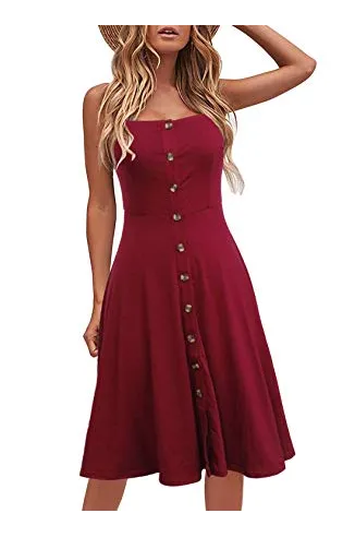 Berydress Women's Casual Beach Summer Dresses Solid Cotton Flattering A-Line Spaghetti Strap Button Down Midi Sundress