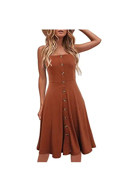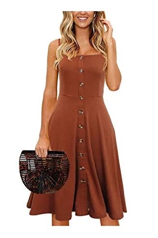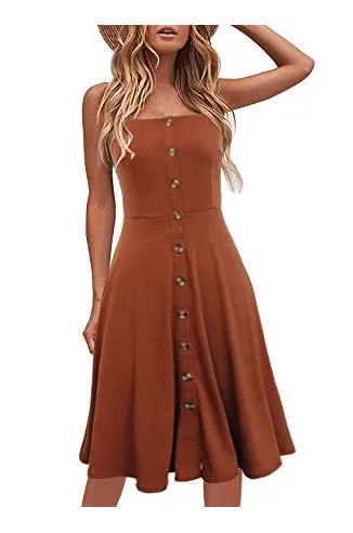 Berydress Women's Casual Beach Summer Dresses Solid Cotton Flattering A-Line Spaghetti Strap Button Down Midi Sundress