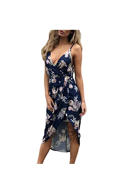 - Women Deep V Neck Strap Sexy Split Beach Midi Dress