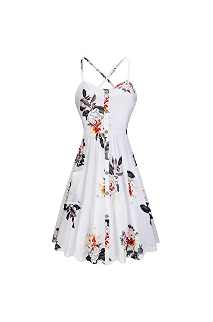 - Style: Sexy Backless, Bohemian Floral Print ,Round Neck, Backless, A Line, Spaghetti Strap, Mini Length, Button Down, With Pockets Swing Flowy Summer Beach Dresses.Simple and classy design, it is a necessity for every wardrobe. Features - Sleeveless/Adjustable Strappy/Slim Fit/Floral Print/Waistline/A-Line/Sundress/ With Pockets
