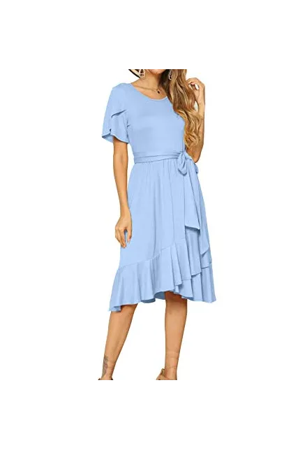 - Features:Casual Style,Stylish Flower Short Sleeve,Round neck,Plain(Soild) Color, Oblique ruffle hem