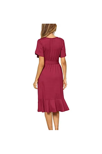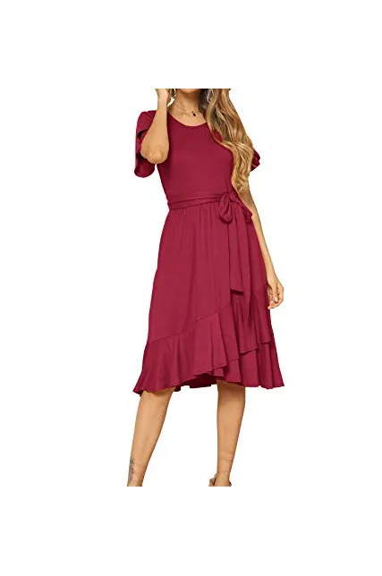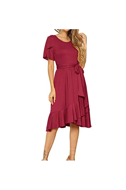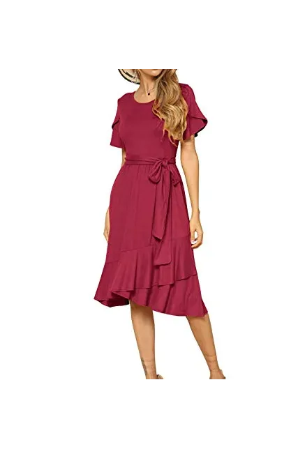 - Features:Casual Style,Stylish Flower Short Sleeve,Round neck,Plain(Soild) Color, Oblique ruffle hem