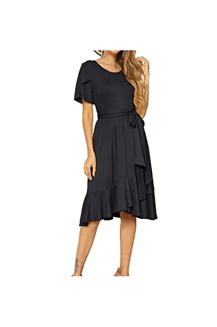 - Features:Casual Style,Stylish Flower Short Sleeve,Round neck,Plain(Soild) Color, Oblique ruffle hem