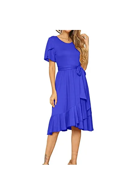 - Features:Casual Style,Stylish Flower Short Sleeve,Round neck,Plain(Soild) Color, Oblique ruffle hem