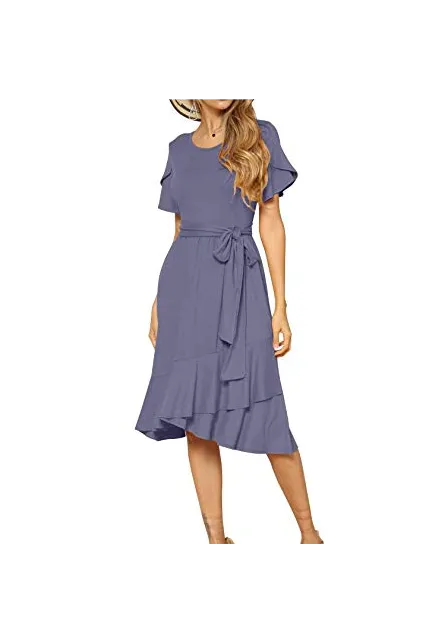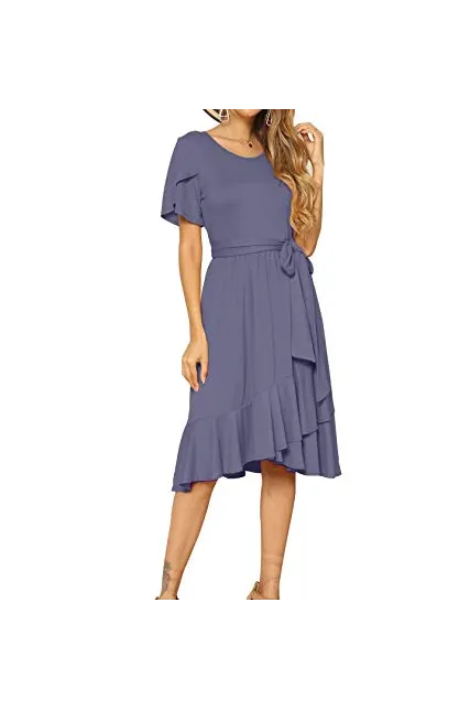 - Features:Casual Style,Stylish Flower Short Sleeve,Round neck,Plain(Soild) Color, Oblique ruffle hem
