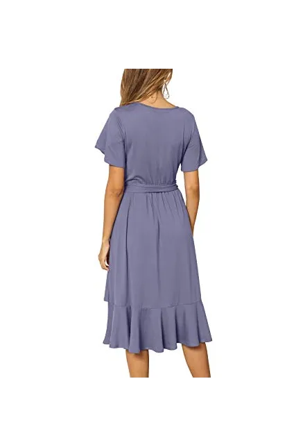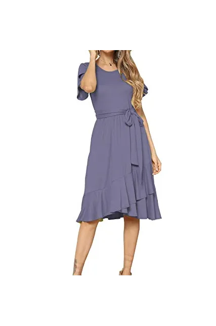 - Features:Casual Style,Stylish Flower Short Sleeve,Round neck,Plain(Soild) Color, Oblique ruffle hem