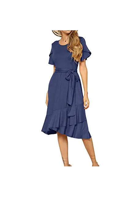 - Features:Casual Style,Stylish Flower Short Sleeve,Round neck,Plain(Soild) Color, Oblique ruffle hem