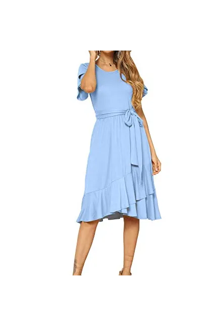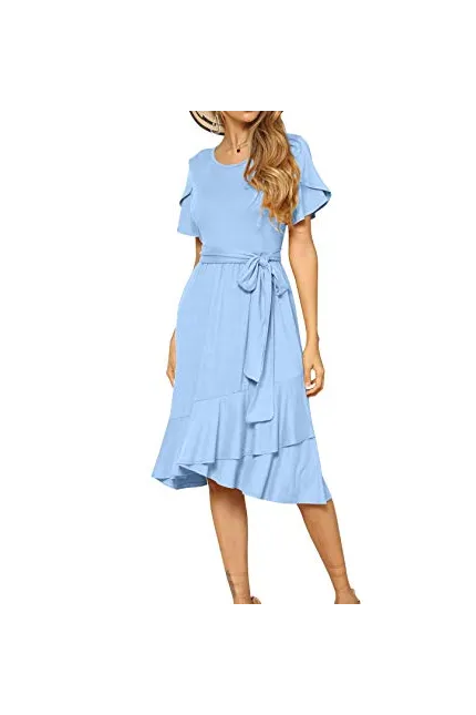 - Features:Casual Style,Stylish Flower Short Sleeve,Round neck,Plain(Soild) Color, Oblique ruffle hem