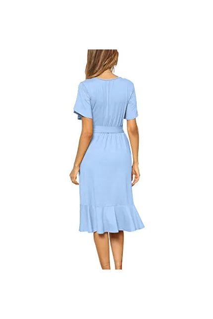 - Features:Casual Style,Stylish Flower Short Sleeve,Round neck,Plain(Soild) Color, Oblique ruffle hem