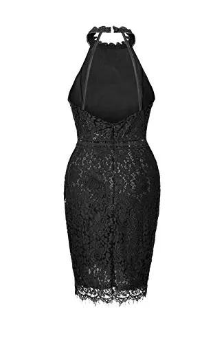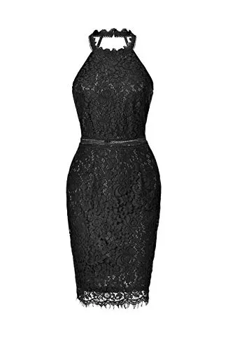 - Unique Design: Halter Neckline, Sleeveless, about knee length, invisible back zipper, peek-a-boo waist, scalloped eyelash lace hem, elegant lace sheath dress