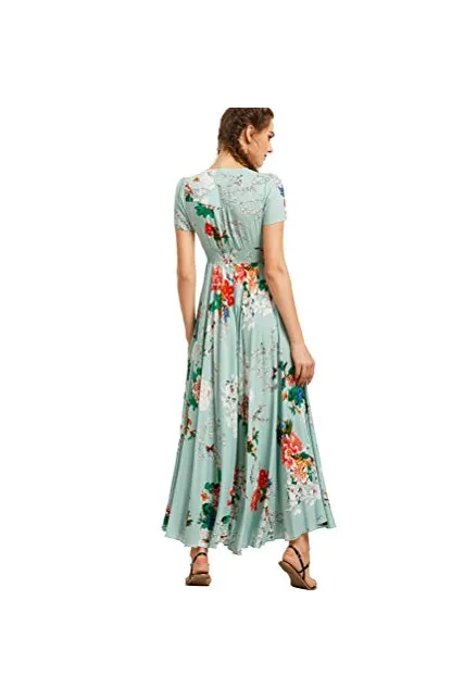 - A Line Buttons Up Flowy Split V-Neck, Short Sleeve,Floral Print,Maxi,Boho