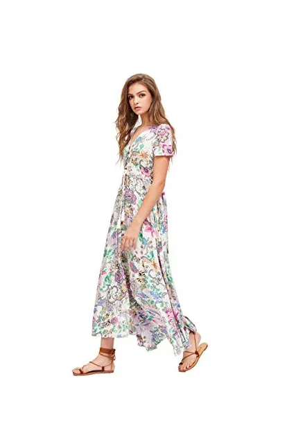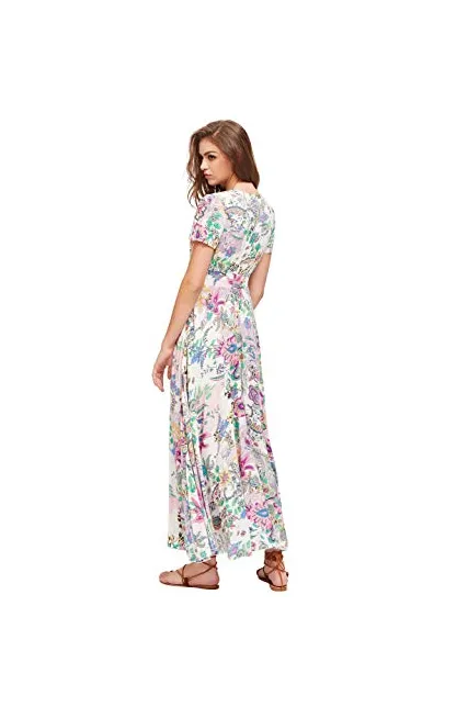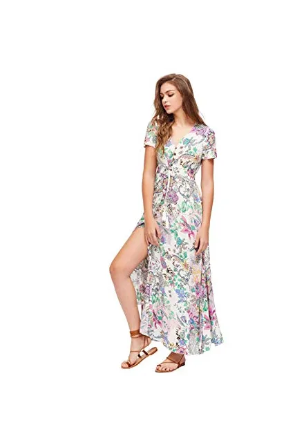 - A Line Buttons Up Flowy Split V-Neck, Short Sleeve,Floral Print,Maxi,Boho