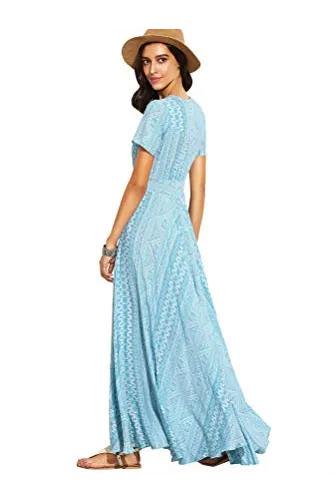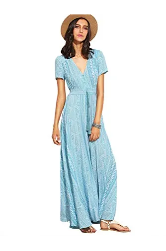 - A Line Buttons Up Flowy Split V-Neck, Short Sleeve,Floral Print,Maxi,Boho