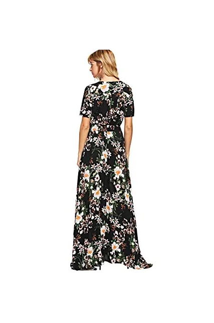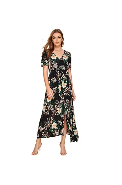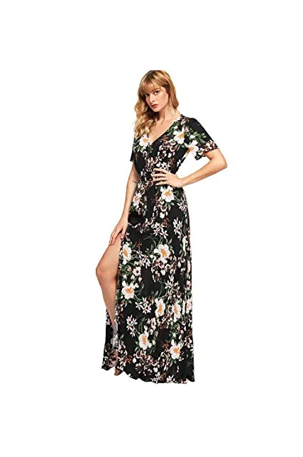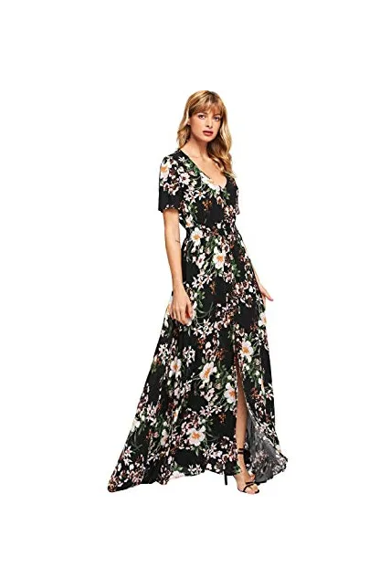 - A Line Buttons Up Flowy Split V-Neck, Short Sleeve,Floral Print,Maxi,Boho