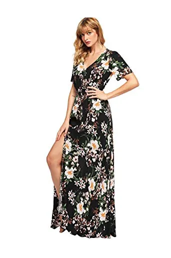 - A Line Buttons Up Flowy Split V-Neck, Short Sleeve,Floral Print,Maxi,Boho