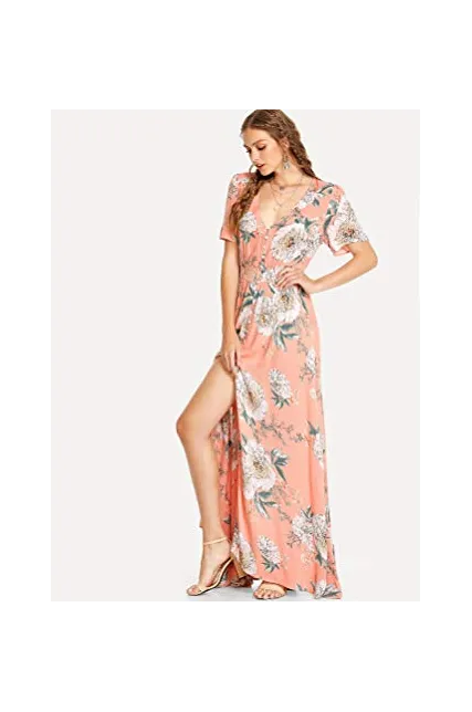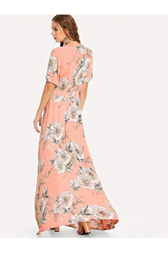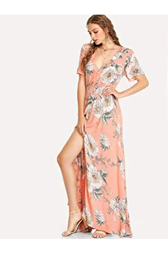 - A Line Buttons Up Flowy Split V-Neck, Short Sleeve,Floral Print,Maxi,Boho