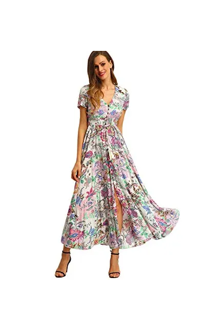 - A Line Buttons Up Flowy Split V-Neck, Short Sleeve,Floral Print,Maxi,Boho